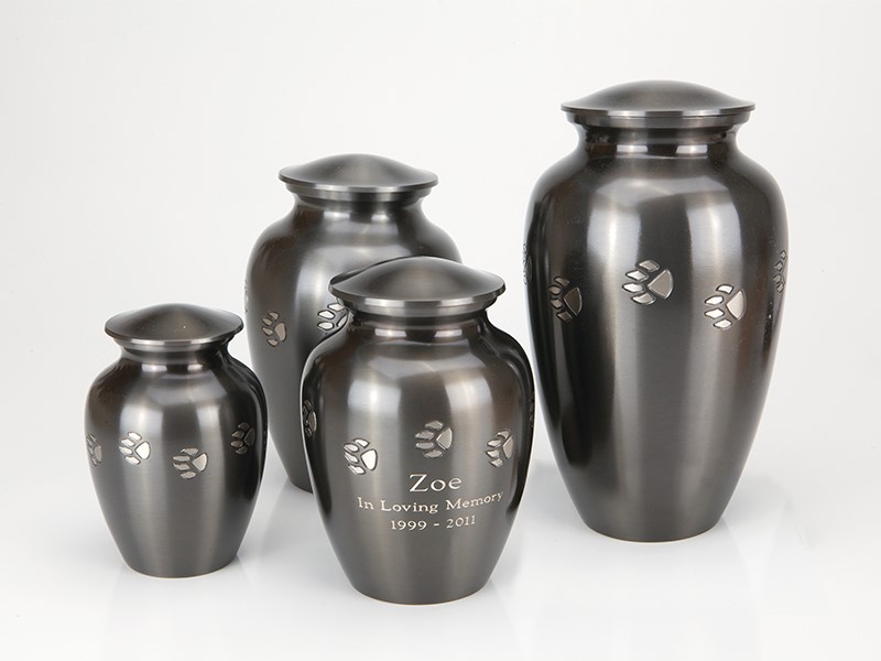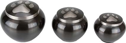 Description: Take your beloved pet home in one of these wonderfully designed "brushed-nickel" colored Paw Print Series urns with hand-carved paw prints and a personalized solid brass display base (if desired). These urns are true works-of-art as they are hand forged and carved by old-world artisans from India.