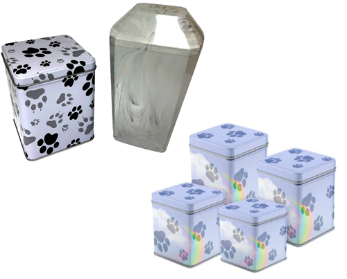 Description: We have three economy urns as a less expensive options to take your beloved pet home. Two metal tins, 1 black and white paw print tin and the other is a light blue pawprint tin with a rainbow. The other is a plastic case mold, which only comes in size small and large.