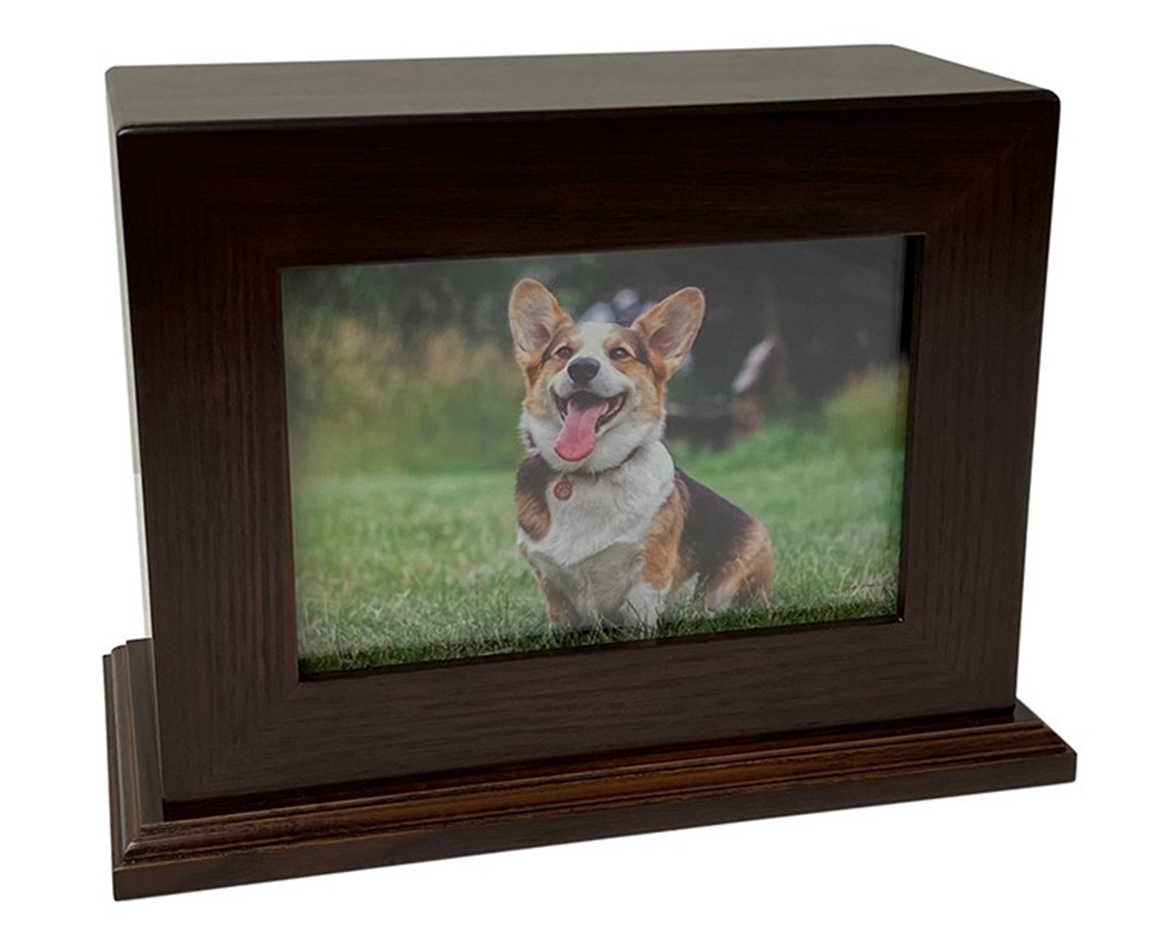Description: Our Framed Photo Urn is designed for pet owners who wish to display their favorite 4”x6” horizontal photograph. This urn style is beautifully crafted from Walnut hardwoods creating a truly lasting memorial to your fallen friend.